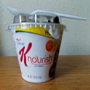 Special K Oatmeal Cup- A hot, filling, fiber-rich meal that is the perfect size for you. Raisins, nuts, a splash of milk, a dab of butter and brown sugar (or maple syrup) really go a long way.