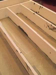 Upon returning to my apartment, I lay down some newspaper and begin to sand the cutlery tray. I should’ve done this outside because my living room got covered in wood dust. After wiping the tray clean, I painted a base coat. I put on two or three more coats because the paint is white, and I spread it thin. That’s what I thought, anyway.