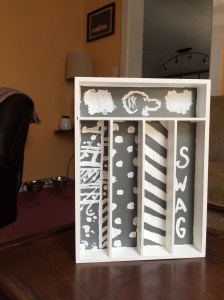Post-bottle-of-riesling, I grab the white paint and a small brush to create a few patterns. To start off simple, I paint the third section in diagonal stripes. Apparently I can’t draw a straight line, so what initially started as a serious craft has turned out to be one of those “Pinterest fails.” I hand my boyfriend another brush and he makes some sort of tribal print while I sploosh several polka-dots. And when he decides to paint a side-profile of our springer spaniel, I find myself writing “SWAG” on the final spot. I can’t wait to chuck this in my dumpster.