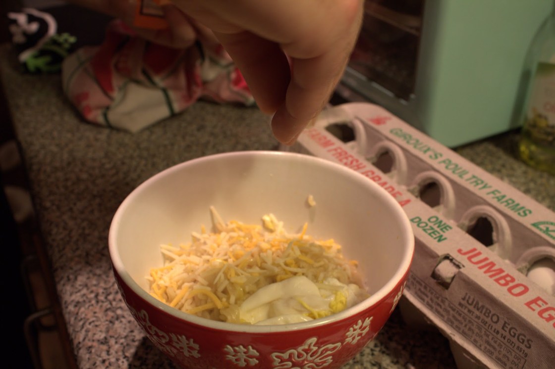 7.After placing the mixture into a bowl, sprinkle a generous amount of shredded cheese of your choice into the ramen.