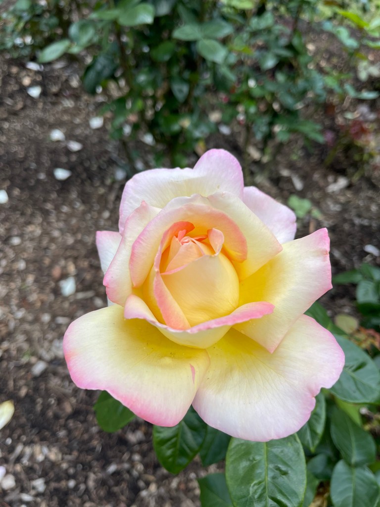 The Rosa Peace. The dominant yellow fades into a cream color and eventually a pink on the edges of the petals. A popular variety, over one hundred million plants were sold by 1992.