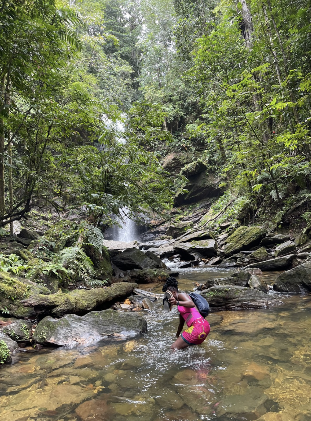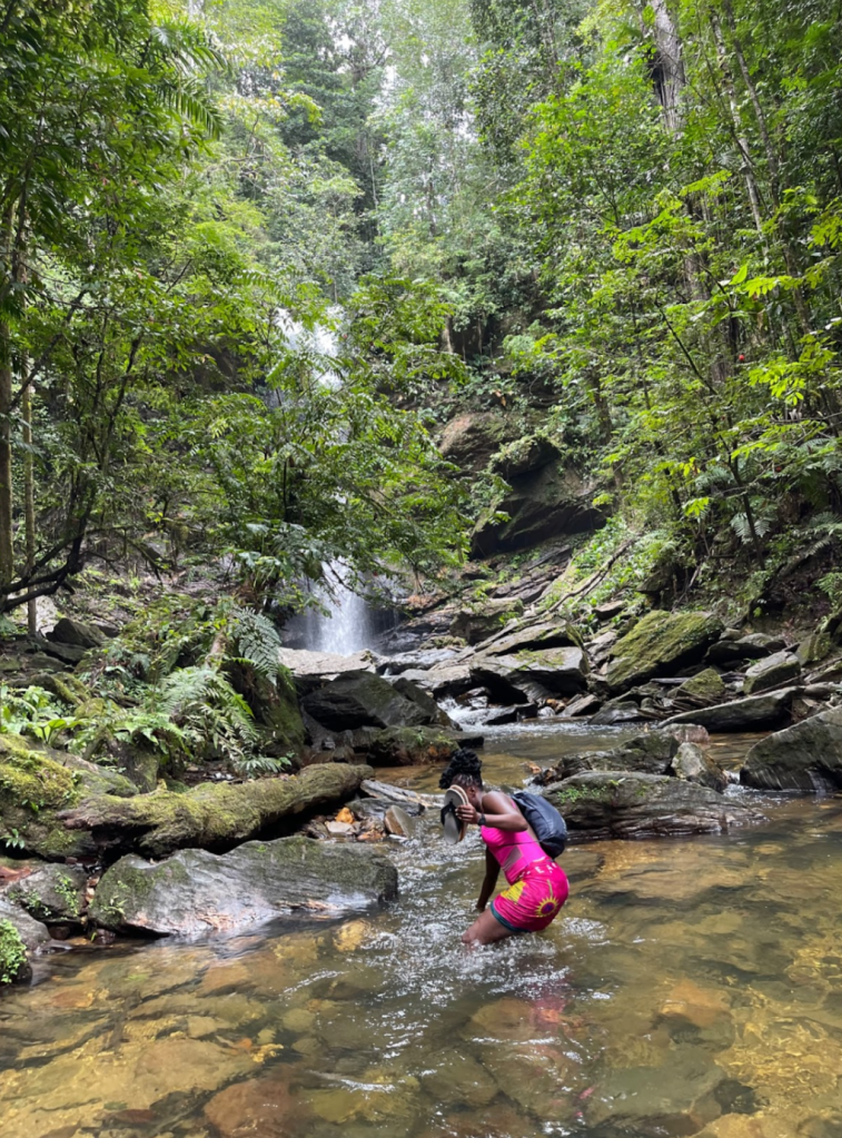 After you pull into the parking lot and pay a small fee of 20 Trinidadian dollars or $3 USD, you will see there are walking sticks available to guide you on the trail before you reach the waterfall. Depending on the time of year it can be very muddy and slippery. The trail is about a 10-15 minute walk before reaching a river bank.