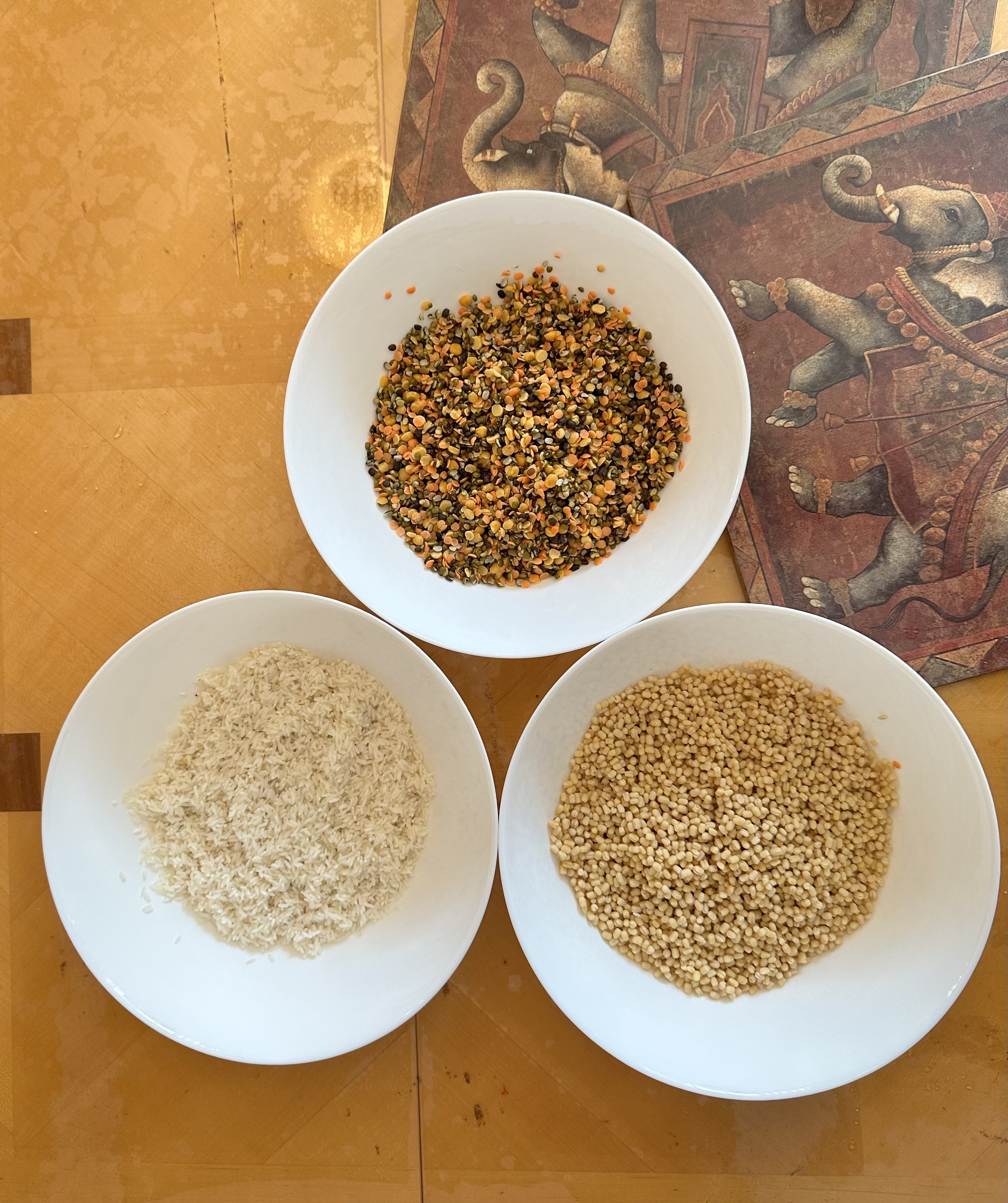 Combine all the ingredients except the cooked rice into one vessel and wash them thoroughly. Next, cover the ingredients with cool water, making sure to leave extra water a few inches above the mix since the lentils will absorb the liquid and expand. Soak everything for a minimum of four hours and up to eight hours overnight on the counter.